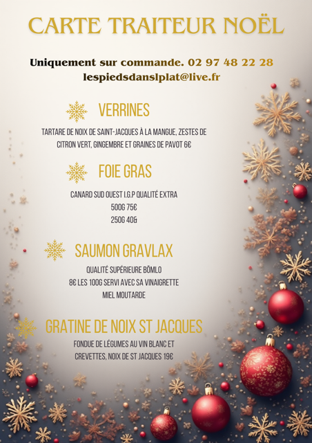 Laissez-vous emporter dans un tourbillon de saveurs avec nos spécialités festives ! Des plats gourmands, préparés avec soin, pour des fêtes pleines de plaisir et de convivialité.